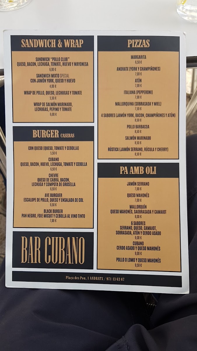 Welcome to Bar Cubano, a charming bar located in the heart of Andratx at Placa des Pou, 1. This inviting spot offers a laid-back atmosphere, making it the ideal place to unwind after a long day. Guests rave about the delicious tapas and snacks, perfectly suited for a quick break. A standout feature is their refreshing tinto de verano, which pairs seamlessly with the bar’s friendly and attentive service. Customers appreciate the warm ambiance and often highlight the superb coffee and breakfast options that cater to both locals and visitors alike. Whether you’re in the mood for a hearty pizza, delectable sandwiches, or just a cold beer, Bar Cubano ensures a satisfying experience. With every visit, you’re not just treated to amazing food, but also a welcoming smile from the staff, making it a must-visit destination in the Balearic Islands.